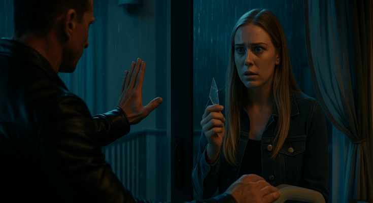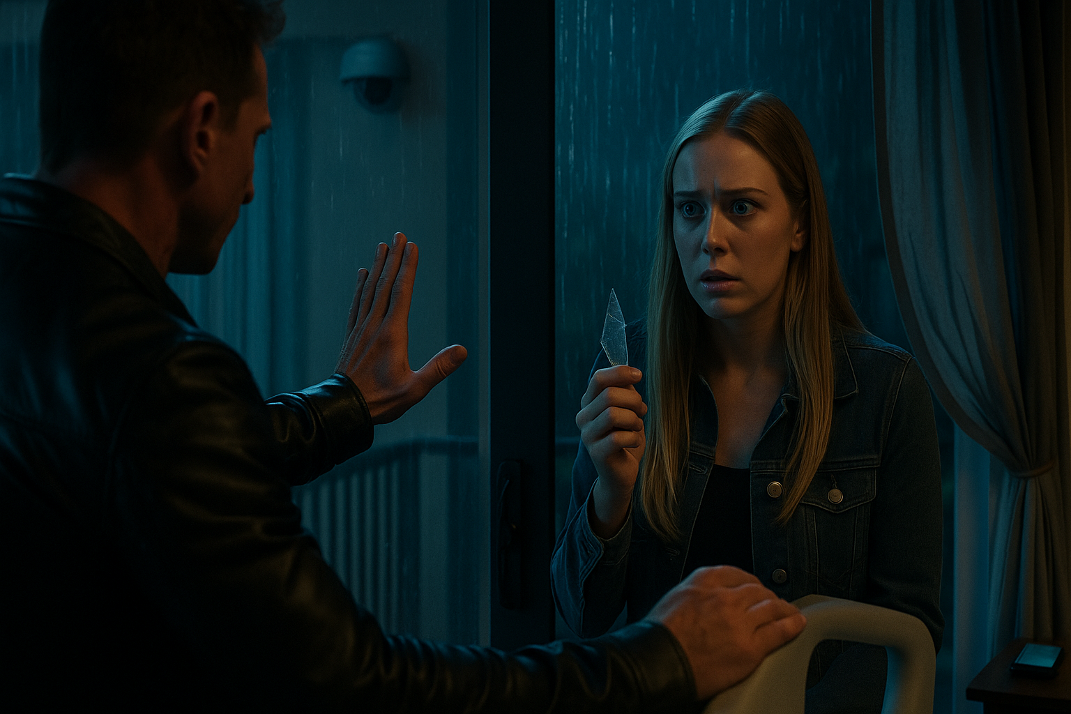 BlogImageCue: 16:9 cinematic screencap — shattered balcony glass and rain flicker; wide 35mm; stormy palette; soft key+fill+hair; no overlay.