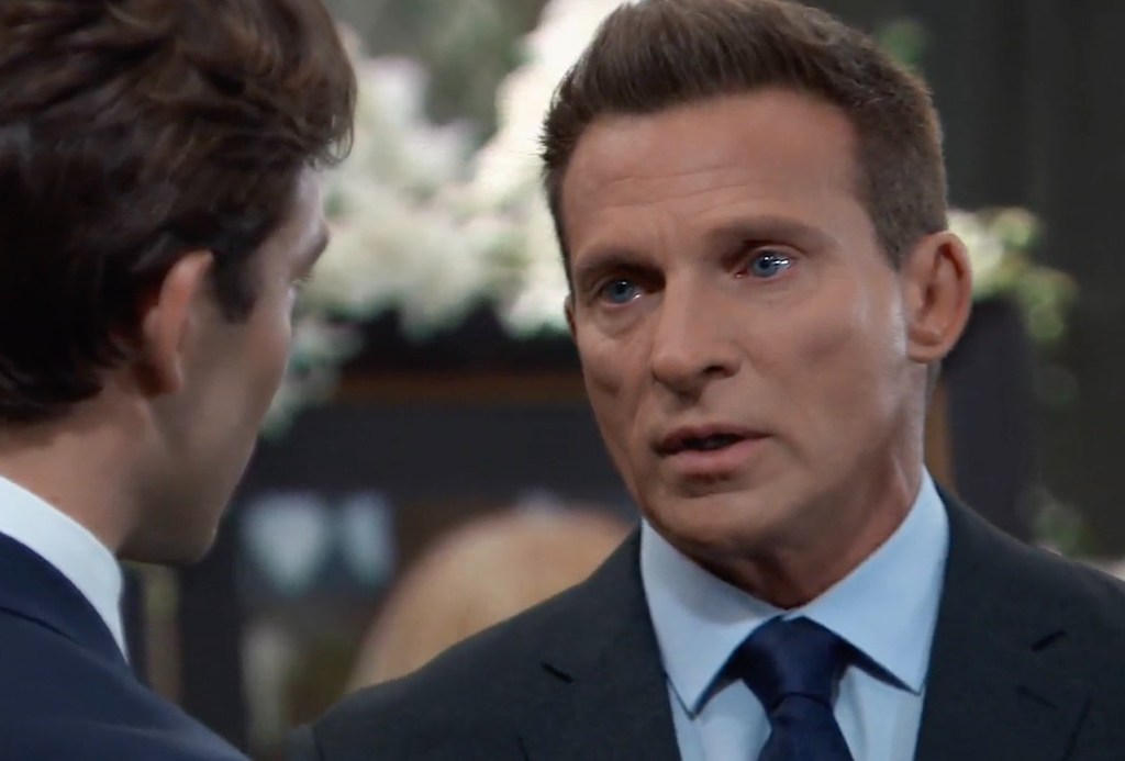 Get out the tissues — you’re going to need them. The memorial service begins quietly. Jason (Steve Burton), who was raised by Monica, waits in the chapel to greet mourners, his grief written on his face. Looking at Monica’s photo, his eyes fill with tears, and he comes to realize that living at the mansion this past year brought him and Monica closer, a time he will always cherish.