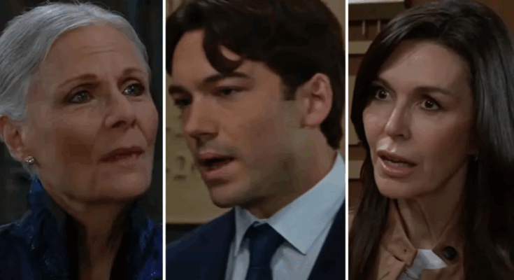 Alexis (Nancy Lee Grahn) has no idea that Ric (Rick Hearst) has escaped the restraints that kept him locked in the basement, and is now lurking around her home. So when she lies down to rest and a knife is put to her throat, is it Ric, looking for revenge? Spoilers also tease that Ava (Maura West) has great timing. Will she actually come to Alexis’s aid?